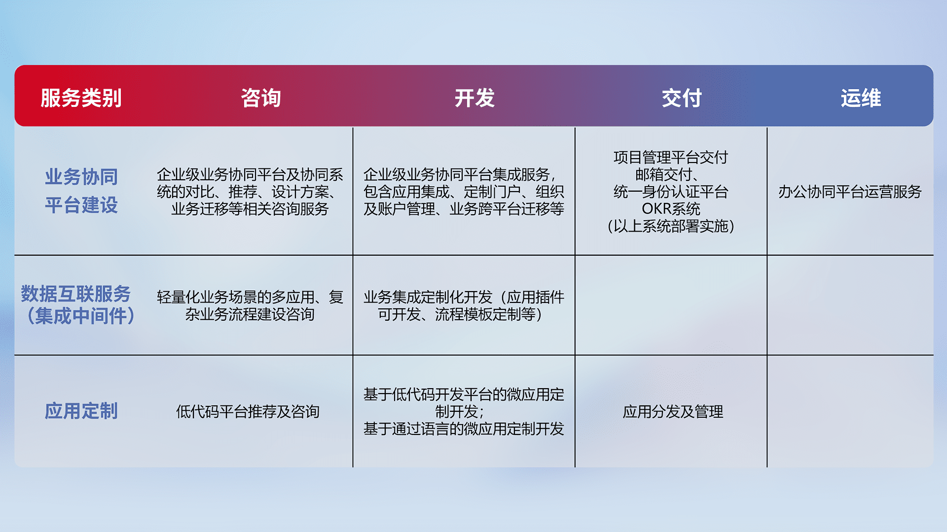 针对钉钉、、企微、、、、IDaas等平台级产品提供产品的规划、、、方案、、、、交付、、、、定制化开发等服务,,,实现如统一协同办公、、、、智能客户服务、、、、混合会议管理、、智能数据查询、、等业务场景,,,实现数字化转型。。