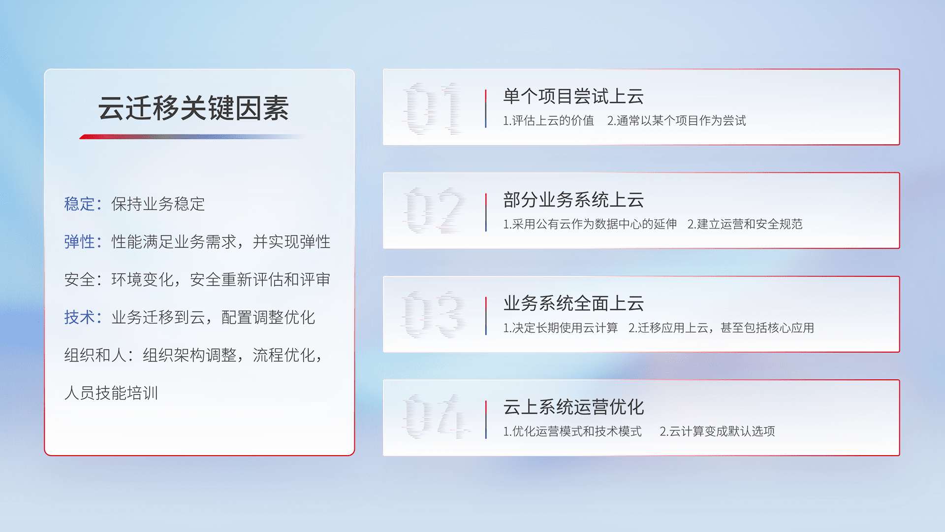 结合实际业务,,从规划设计、、云平台选型、、云原生改造、、、、数据迁移、、、、集成交付,,,迁移全过程为客户识别最佳上云路径,,,,做好风险识别管理,,,设计网络架构、、身份权限、、安全审计合规、、操作审计、、、、日志审计、、、监控告警策略、、多站点容灾设计等,,,,对云上基础设施进行整体规划,,,,提升IT治理水平,,以满足弹性、、、、高可用、、、、高性能的需求。。。