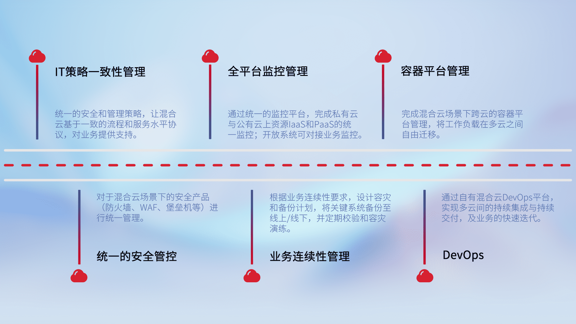 通过多云纳管,,,,以统一的资源数据模型把客户的云资源进行抽象和封装,,,进而实现对多云资源的统一操作,,,,保障云资源管理的可靠性、、稳定性与可用性。。。。量身定制化运维内容,,,配置、、开发运维、、、、补丁管理、、、备份、、、、监控、、、认证和访问管理、、、审计和日常巡检等,,保障在用云过程中的可靠度,,,稳定度以及高可用率。。。