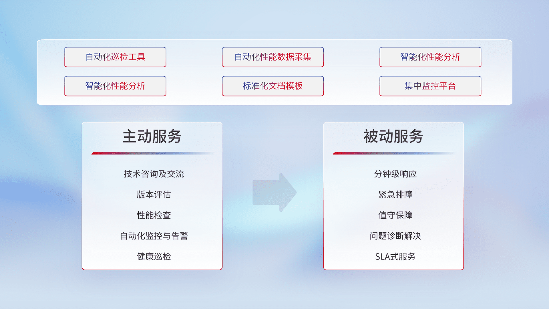 智能化工具和标准化文档,,,,保障服务质量,,提供主动服务(包含技术咨询、、、版本评估、、性能检查、、、、自动化监控与告警、、、、健康巡检)和被动服务包含(分钟级响应、、、、紧急排障、、、、值守保障、、问题诊断解决、、、SLA服务)。。